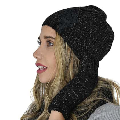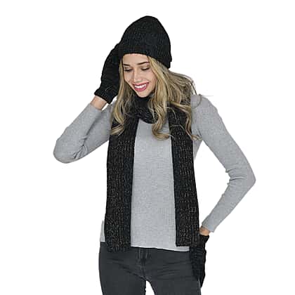 3 Piece Set - 100% Acrylic Knitted Scarf Hat and Gloves - Black