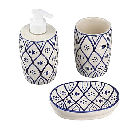 3 Piece Set - Ceramic Bathroom Accessories (Included Liquid Soap Dispenser, Soap Tray & Tumbler) - Blue and White