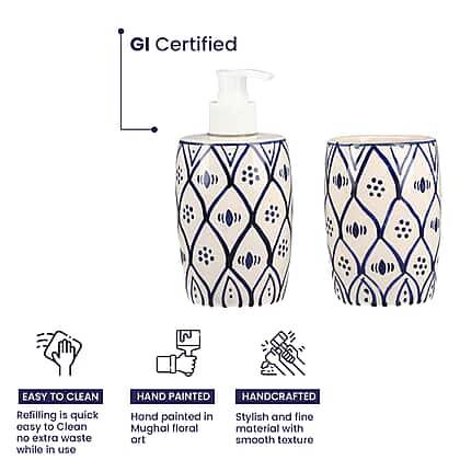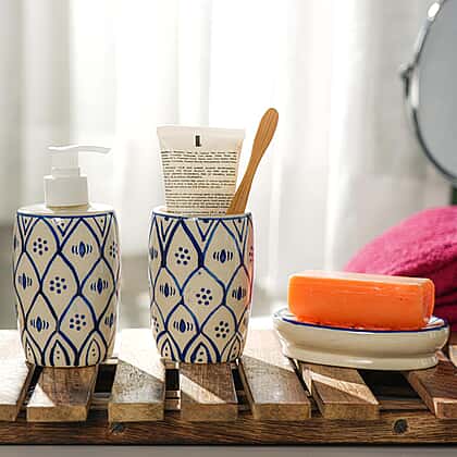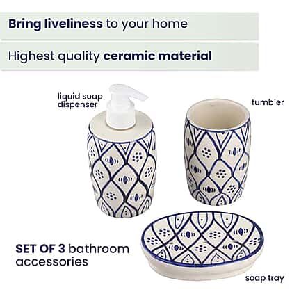 Set of 3 bathroom accessories. Includes liquid soap dispenser, soap tray and tumbler. Made of ceramic, durable, chemical and corrosion resistant, and easy to clean. Making goes through baking, drawing, painting, re-baking and glazing. Adds durability, artistry and long life to the piece. Stylish pieces are hand-painted in floral art. Environment friendly product, stylish and refined material with smooth texture.