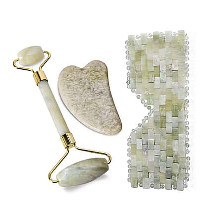 - The set includes a jade roller, jade eyes mask, and jade scraping plate