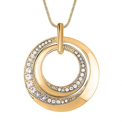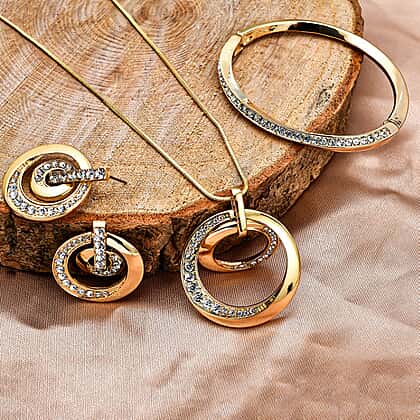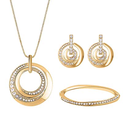 3 Piece Set - White Austrian Crystal Bangle (Size - 6.75 ), Necklace (Size - 24 with 2 Inch Ext.) and Earrings in Yellow Gold Tone.