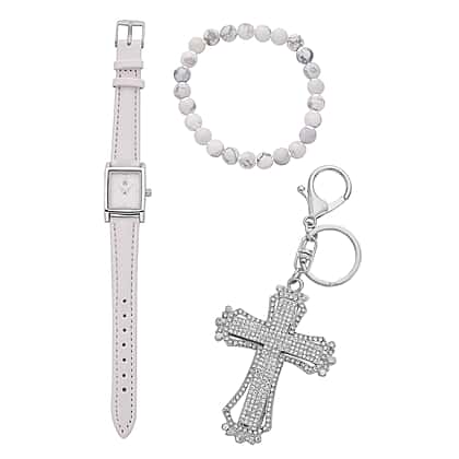 3 Piece Set - White Howlite Stretchable Beads Bracelet (Size 8), White Austrian Crystal Studded Cross Key Chain and STRADA Water Resistant Watch with White Strap