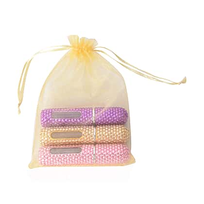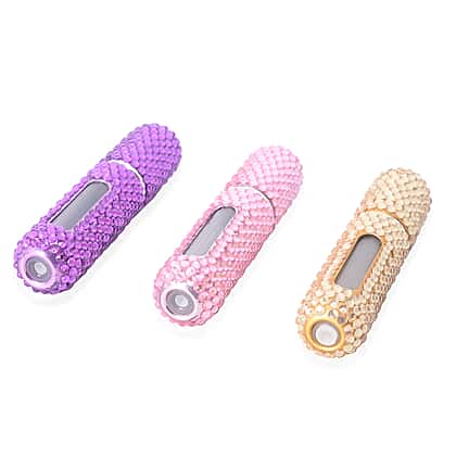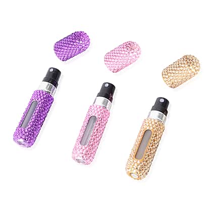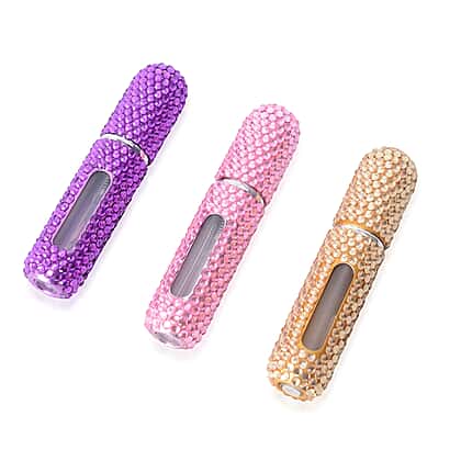 - A handy, practical three piece set of perfume bottles in enticing colours such as purple, pink and golden