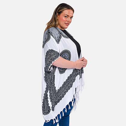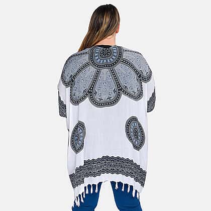 The Bohemian print on the Tamsy Brand printed Kimono with tassels brings out the wearer's creative and free-spirited side. Full sleeves and an open front neck create a stunning appearance. Tassels at the ends add attractive decoration and protect the actual kimono. It's all the same. All body types look good in loose clothing. Durability is guaranteed by strong hand stitching. Ideal as a cardigan, shrug, or beach cover-up. made entirely of viscose and is versatile in terms of style. gives off a silky feel and has a lovely drape.
