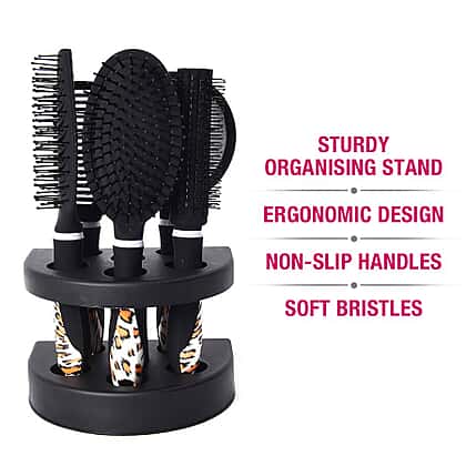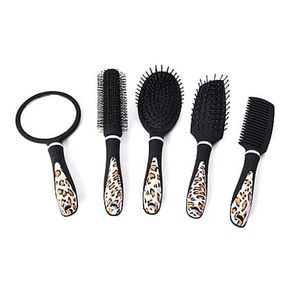 5 Piece Set - Hair Brushes (includes 1 Flat Comb, 1 Flat Modelling Brush, 1 Roll Modelling Brush, 1 Massage Brush) and 1 Mirror with Leopard Print Hand Shank - Black