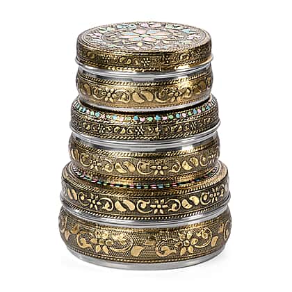 Bring decorative charm and practical storage to your space with the Livmore Set of 3 Handcrafted Floral Oxidised Storage Containers. Each container features intricate floral detailing inspired by traditional craftsmanship, creating a striking decorative accent for your dressing table or shelf. The oxidised gold and silver tone finish enhances the detailed patterns while giving the set a vintage-inspired appeal. Designed in three convenient sizes ranging from 8cm to 11cm, these containers are ideal for storing jewellery, small accessories or keepsakes. Both decorative and functional, this handcrafted set adds character, style and organisation to your home decor.