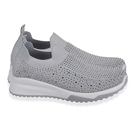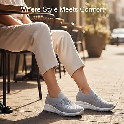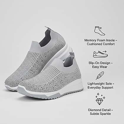 Finding shoes that feel good all day is easy with these slip-on trainers, designed to bring comfort and style together effortlessly. The lightweight knit upper stretches softly around the foot, while the sparkling diamond detailing adds a subtle touch of personality to everyday outfits. A cushioned memory foam insole supports every step, and the flexible sole helps keep you steady on busy days. The easy slip-on design makes them ideal for relaxed mornings, quick errands or casual meet-ups. Finished in a versatile grey shade, they work beautifully with jeans, leggings or soft tailoring for comfortable, fuss-free wear.