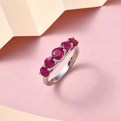 Inspired by the 5-stone theme, this colourful ruby ring will make you shine for the right reasons. A 5-stone ring symbolises five qualities of a good relationship – love, commitment, trust, communication, and empathy. This beautiful ring features five round-shaped rubies in four-prong settings and exudes deep red hues to capture attention. Laced with diamond rounds, this jewel is made of 950 platinum that offers luxurious appeal and durability. Pair this ring with matching accessories to leave a lasting impression on everyone.