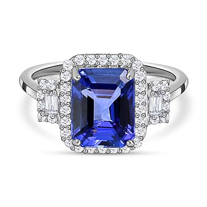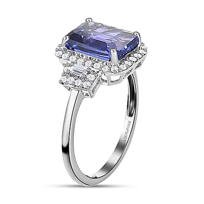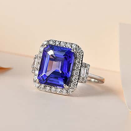 - Tanzanite Octagon is surrounded by a glittering diamond halo.