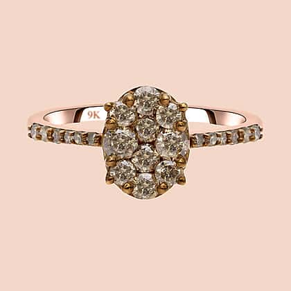 This natural champagne diamond ring is an exclusive jewel designed on the cluster theme. The round-shaped forefront draws everyone’s attention. The shoulders of shank is embedded to add more details to the ring. The rosy finish further complements the wine-like hues of the diamonds. The sleek, sparkling shank adds a glamorous look to this natural diamond jewel. Crafted in 9k rose gold for a feminine beautiful touch.