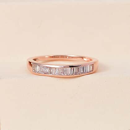 The 9K gold ring with pink diamonds in baguette cut on the band. This ring is plated in 9K rose gold for extra charm, femininity and romance. This ring is crafted for everyday wear and complements all outfits. This half eternity band ring is SGL certified which ensures you of the high quality materials used to craft it.