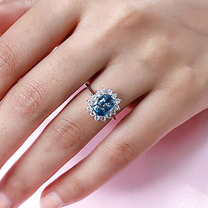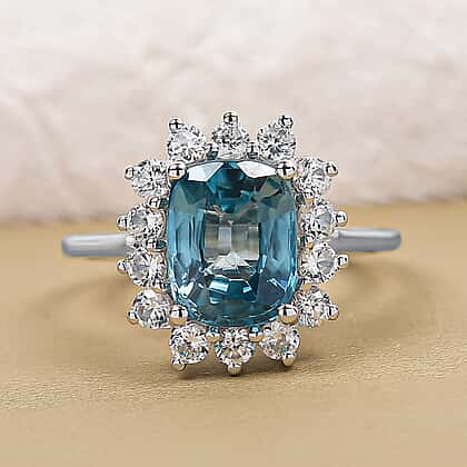 9K White Gold AA Blue Zircon and Natural Cambodian Zircon Halo Ring 3.63 Ct