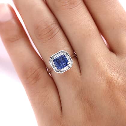 Celebrate the timeless appeal of the solitaire design, which has endured for millennia and will always be in style. A gorgeous piece of jewellery for any occasion is this Kyanite and Natural Cambodian Zircon Ring in Platinum Plated Sterling Silver. The main stone in this ring, a 2.09 carat Asscher-faceted Kyanite, is surrounded by baguette-cut diamonds that are placed in a bar setting. Kyanite Octagon 7x7mmMM Asscher Cut and baguette cut diamonds are used to accentuate the ring's lustre.