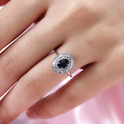 The halo ring in 9K White Gold is studded with Ocean Blue Sapphire with a four-prong setting in the centre. The gemstone is surrounded by two rows of different shapes of diamonds, creating a boundary on the cathedral head of the shank. The inner row contains round single cut diamonds in a shared prong setting, whereas the outer row has baguette-cut diamonds in a bar setting.
