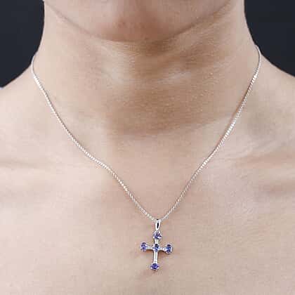 9K White Gold AA Tanzanite and Moissanite Cross Pendant 1.01 Ct