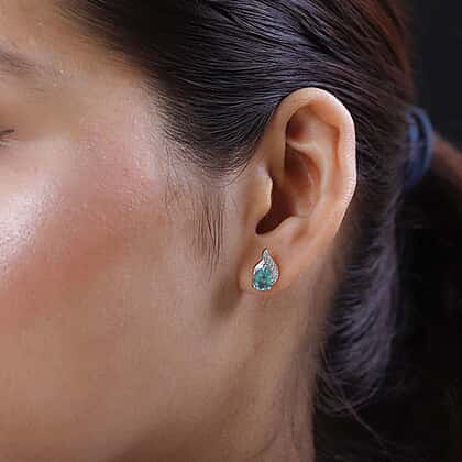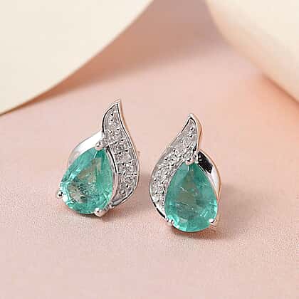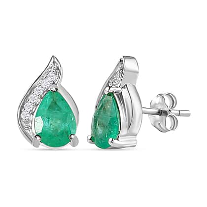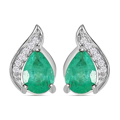 9K White Gold Zambian Emerald and Diamond (G-H) Stud Earrings 1.28 Ct.