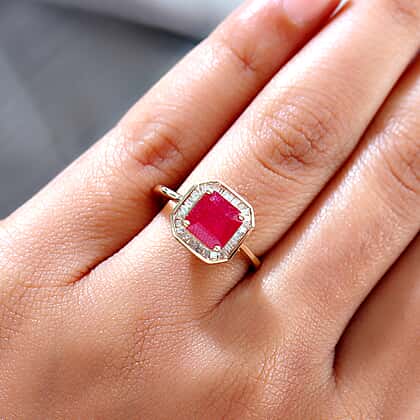 - GEMSTONE DETAILS: Through prongs, an cushion Asscher faceted cut AA African Ruby and a number of round faceted cut Diamonds have been studded onto this ring