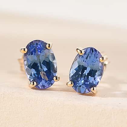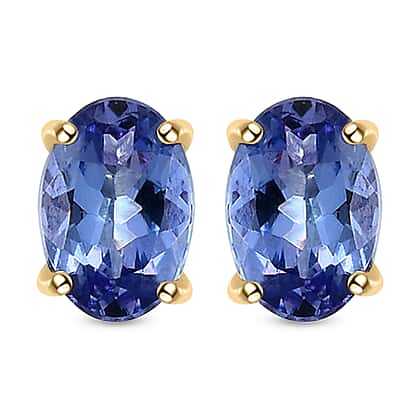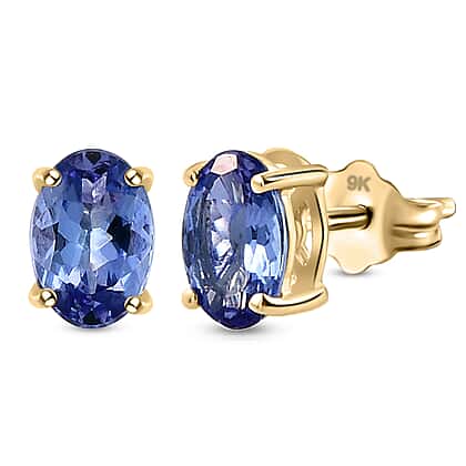 These sophisticated 9K yellow gold stud earrings feature oval-shaped natural AA quality tanzanites (0.952 carat). The gemstones are positioned in a four-prong setting, which allows them to reflect maximum light and brings out the blue in all its brilliance. Tanzanite exhibits trichroism, which makes it emit varying hues when viewed from different angles.