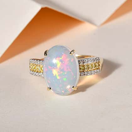 9K Yellow Gold AAA Ethiopian Welo Opal, Natural Yellow Diamond & White Diamond (G-H) Ring 4.10 Ct