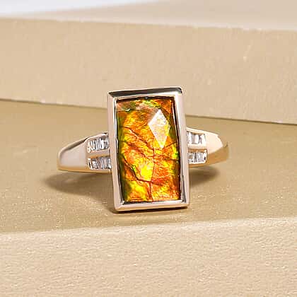- The ring features a large (12x7mm) ammolite baguette of 2.846 Carat
