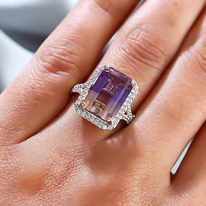 - STONE DETAILS: An octagon shaped faceted Anahi Ametrine sits at the head exuding beautiful purple hues while round cut and faceted Zircon surround it to form a halo around it and add a contrasting sparkle extending up to the split shoulders