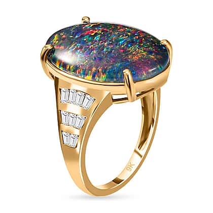 9K Yellow Gold Australian Boulder Opal (OV18X13) and Natural Zircon Ring 7.00 Ct.