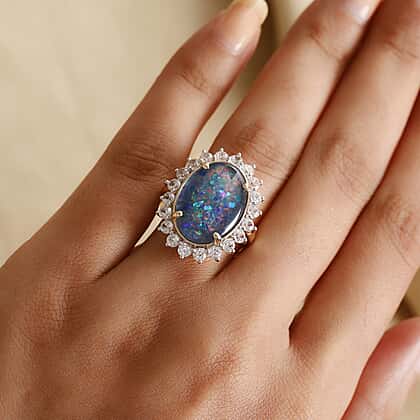 9K Yellow Gold Australian Triplet Boulder Opal & Natural Zircon Ring 9.36 Ct.
