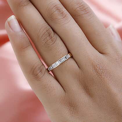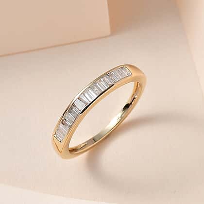 - Diamond baguettes are channel set into the band for a half-eternity look.