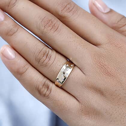 - This 9K yellow gold ring adorned with flush-set I3 white diamonds exudes timeless sparkle.