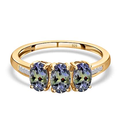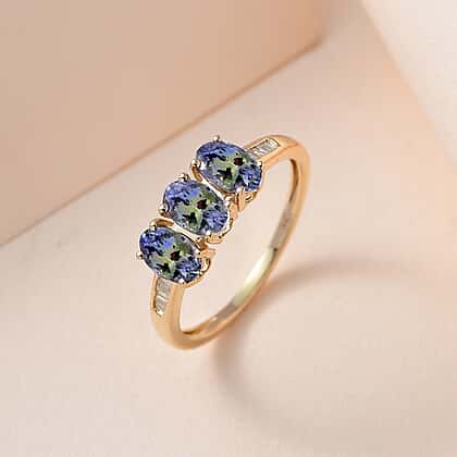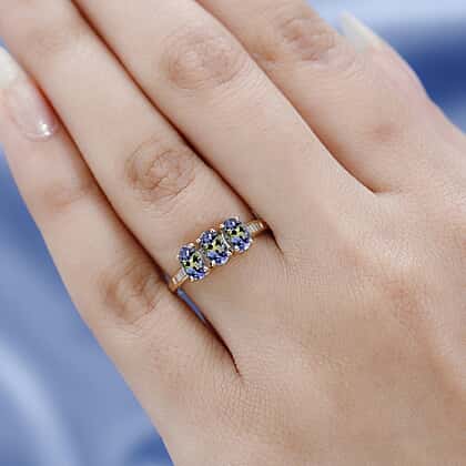 1.45 Ct AA Green Tanzanite and Diamond Trilogy Ring in 9K Yellow Gold