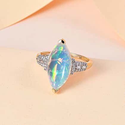 9K Yellow Gold Natural Ethiopian Welo Opal (3.75 Cts) and Moissanite Ring 4.05 Ct