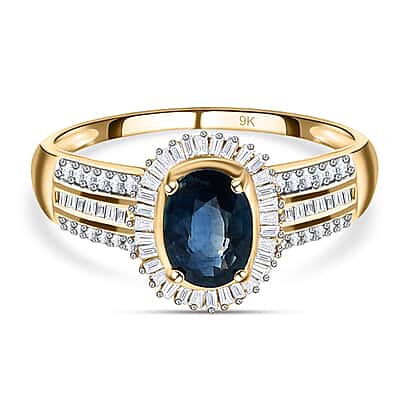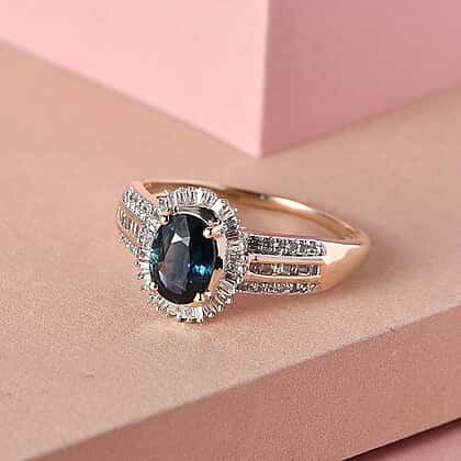 9K Yellow Gold Ocean Teal Sapphire and Diamond Ring 1.30 Ct