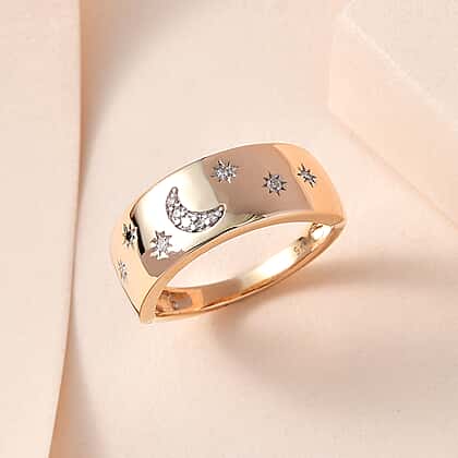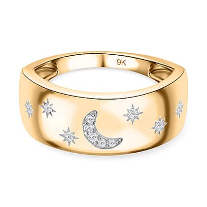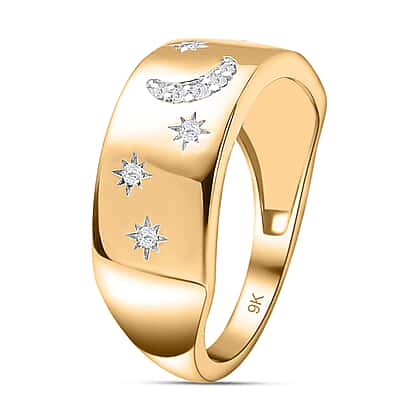 Behold the beauty of this luxurious band ring decorated with the sparkle of real diamond and crafted in 9K yellow gold. The ring features white diamonds certified for excellent clarity and colour. The diamonds are embedded within star and crescent moon shaped motifs in a flush setting in this ring lending a very celestial look to the whole design.