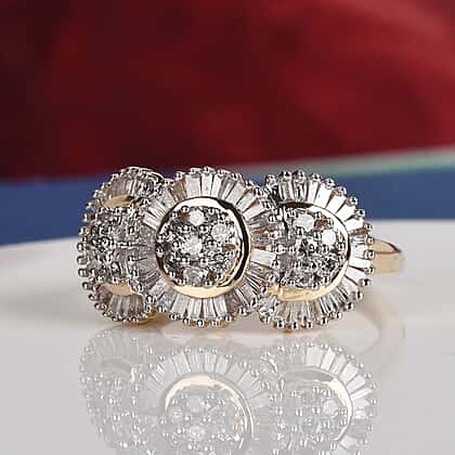 - Three elegant floral motifs are formed by a multitude of round-cut and baguette-cut diamonds on the ring