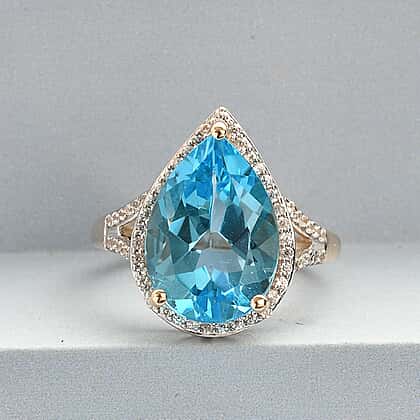 - GEMSTONES: The pear cut Blue Topaz is radiant with catchy flashes owing to its rare hues and striking lustre. Zircons aligned forming the outline, accent it with a diamond like brilliance, extended up to the shank, with a weight of 6.4 cts