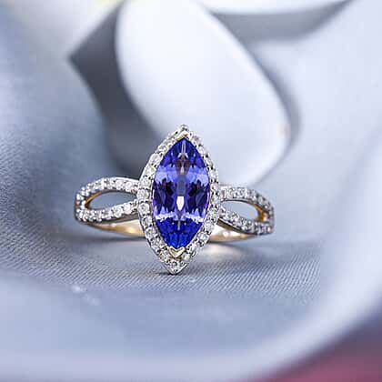 - STONE DETAILS: A difficult to achieve marquise cut is rendered to the centre Tanzanite with a faceted finish which is held in a V-prong setting, a halo of round cut and faceted Diamonds surround the centre stone for a contrasting and regal look, all held in a shared prong setting