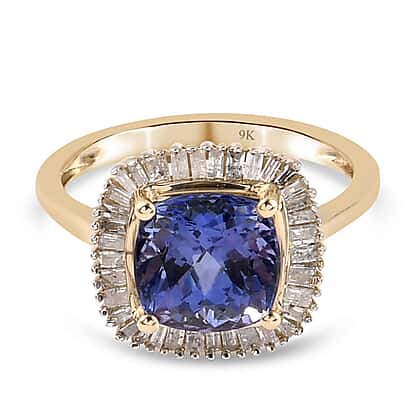 Cushion-Cut Tanzanite and Diamond Halo Ring in 9K Yellow Gold 2.8 ct.
