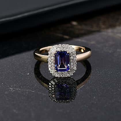 9K Yellow Gold Tanzanite, White Diamond Double Halo Ring 1.18 Ct.