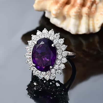 African Amethyst, White Zircon Double Halo Ring in Rhodium Overlay Sterling Silver