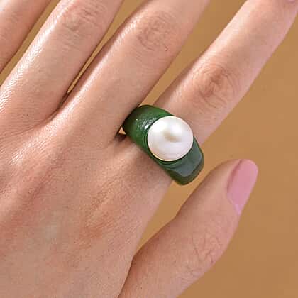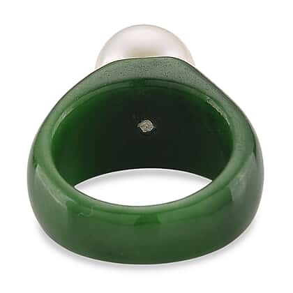 AAA Edison Pearl (12 mm) and Green Jade Ring in 18K Vermeil Yellow Gold Plated Sterling Silver 33.58 Ct.