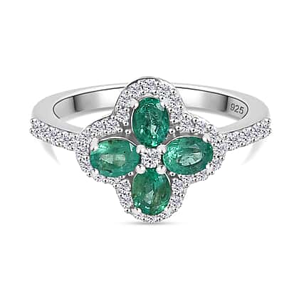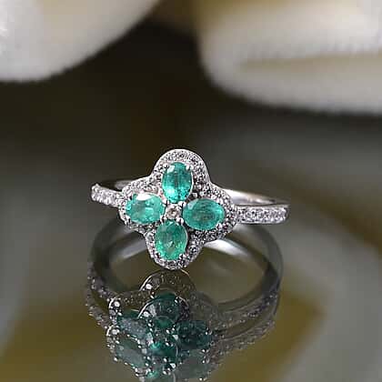 AAA Gemfield Emerald & White Zircon Ring in Rhodium Overlay Sterling Silver 1.12 Ct.