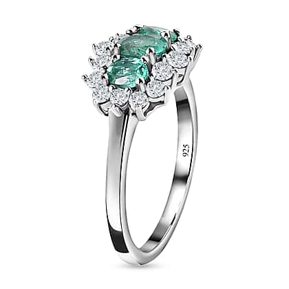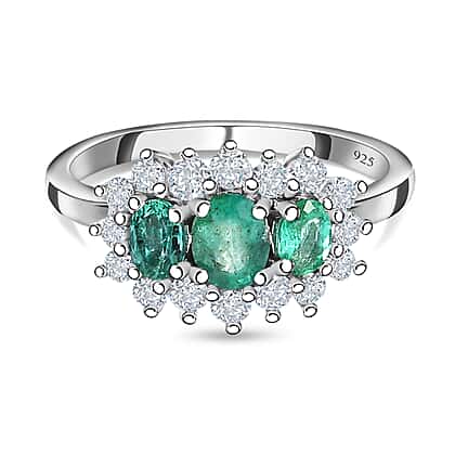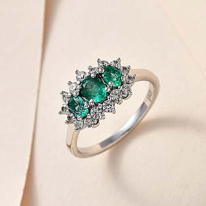 AAA Gemfields Emerald & Natural Zircon Ring in Platinum Overlay Sterling Silver 1.26 Ct.