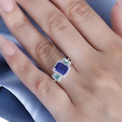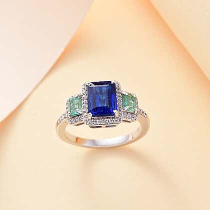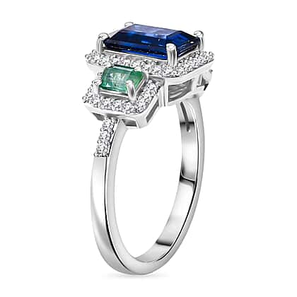 AAA Kashmir Kyanite, Gemfields Zambian Emerald & Natural White Zircon Ring in Rhodium Overlay Sterling Silver 2.73 Ct.