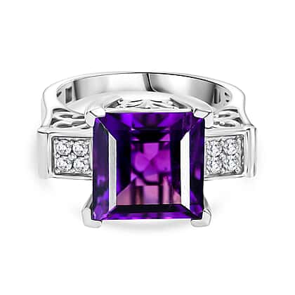 African Amethyst & White Zircon Solitaire Ring in Rhodium Overlay Sterling Silver 5.16 Ct.