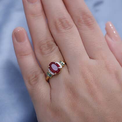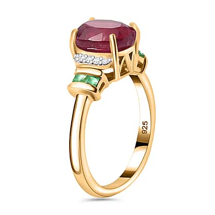 African Ruby , White Zircon , Zambian Emerald Main Stone With Side Stone Ring in 18K YG Vermeil Sterling Silver 2.72 ct 3.158 Ct.