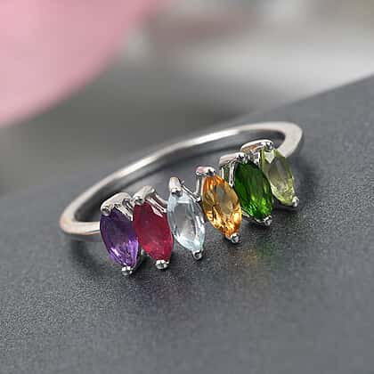 Ruby Chrome Diopside Peridot and Multi Gemstone 6 Stone Ring in Platinum Plated Sterling Silver