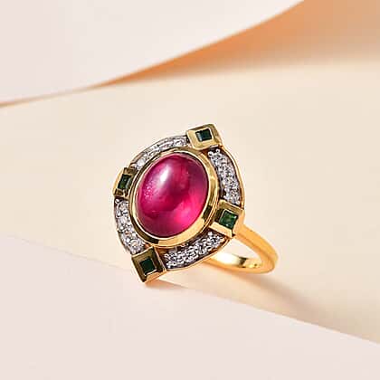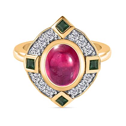 African Ruby, Zambian Emerald & Natural Zircon Ring in 18K Yellow Gold Vermeil Plated Sterling Silver 5.06 Ct.