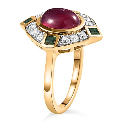 African Ruby, White Zircon, Zambian Emerald Ring in 18K Vermeil YG Sterling Silver