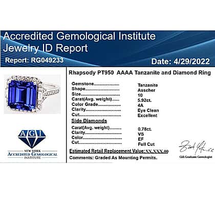 AGI Certified and Appraised RHAPSODY 950 Platinum AAAA Tanzanite and VS EF Diamond Halo Ring 8.50 Grams 6.70 ct