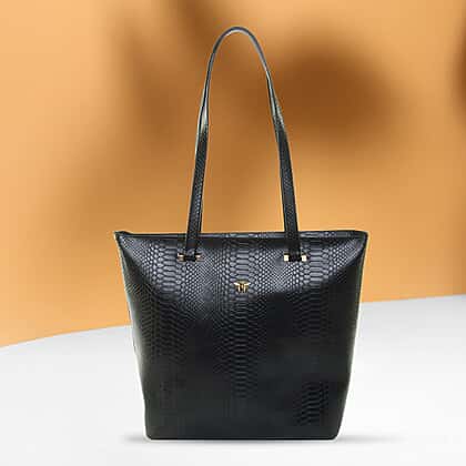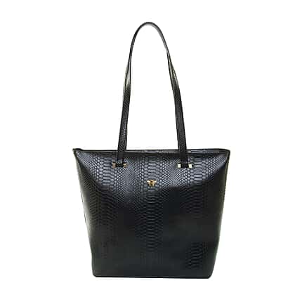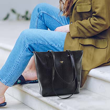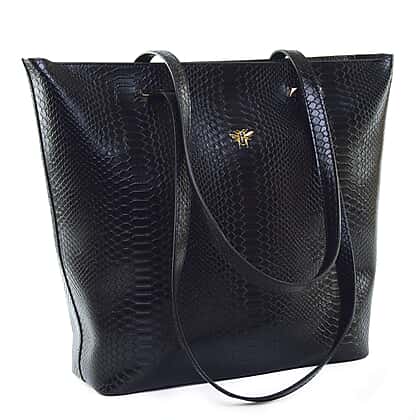 Luxury vegan leather Knightsbridge tote bag with snake pattern design and Alice Wheeler distinctive honey bee logo. There is enough space to keep your belongings organised, and the zipper closing prevents you from tumbling out of your bag. This bag comes with a detachable shoulder strap that allows you to carry it in a variety of ways. This bag has a polyester lining that makes it more convincing and durable.